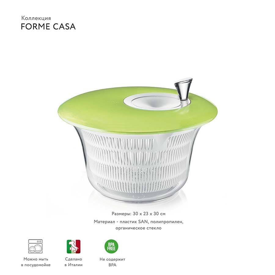 Каждая хозяйка знает, что мокрые листья салата неохотно расстаются с влагой и способны испортить даже самое изысканное блюдо. Вместо бумажных салфеток и хлопковых полотенец используйте специальную сушилку для салата, которая гораздо быстрее справится с данной задачей. Во-первых, так вы уменьшите слишком большой расход салфеток, а во-вторых, сохраните форму и "пышность" салата, которая теряется, когда вы промакиваете листья полотенцем. Сушилка состоит из внешнего контейнера с нескользящим основанием, который можно использовать просто для сервировки, и внутреннего фильтра, который пригодится вам во время размораживания продуктов или мытья овощей. Сама сушилка легко разбирается на составные части и пригодна для мытья в посудомоечной машине в режиме деликатной мойки. Forme casa - это серия доступных и практичных кухонных аксессуаров от Guzzini. Она отличается понятным и функциональным дизайном, который подходит для ежедневного использования. Товары коллекции представляют собой яркие и надежные инструменты для кухни с долгим сроком службы и привлекательными характеристиками. Вся продукция производится в Италии и соответствует международным стандартам качества.