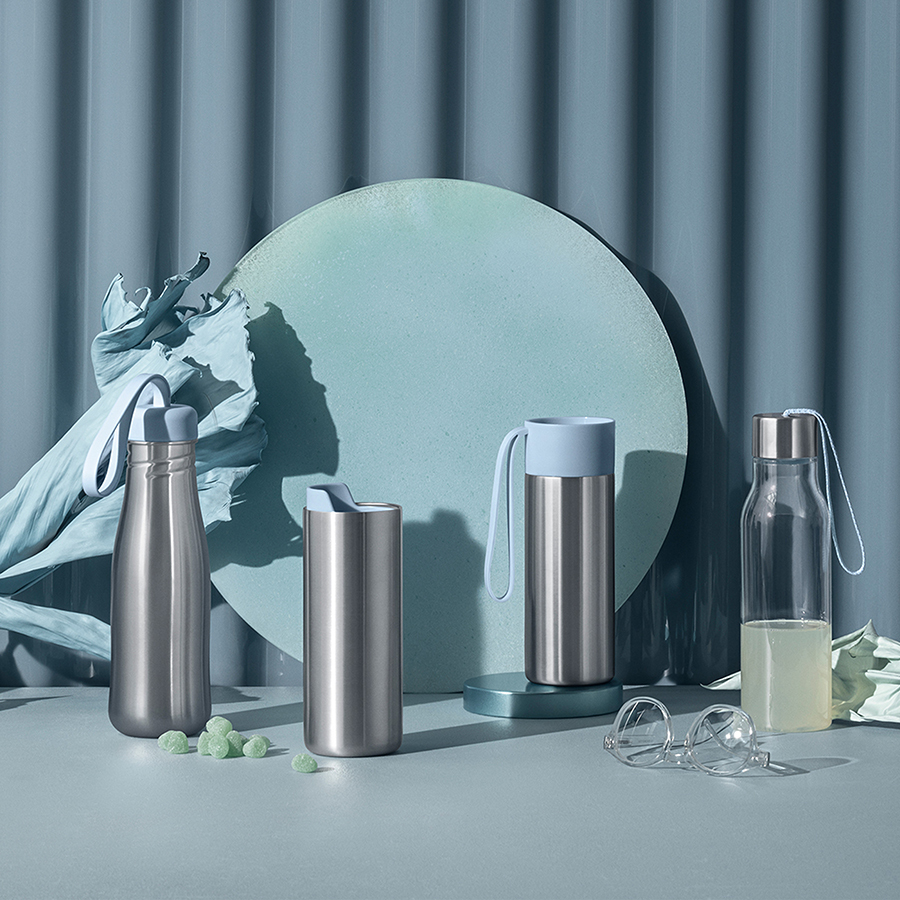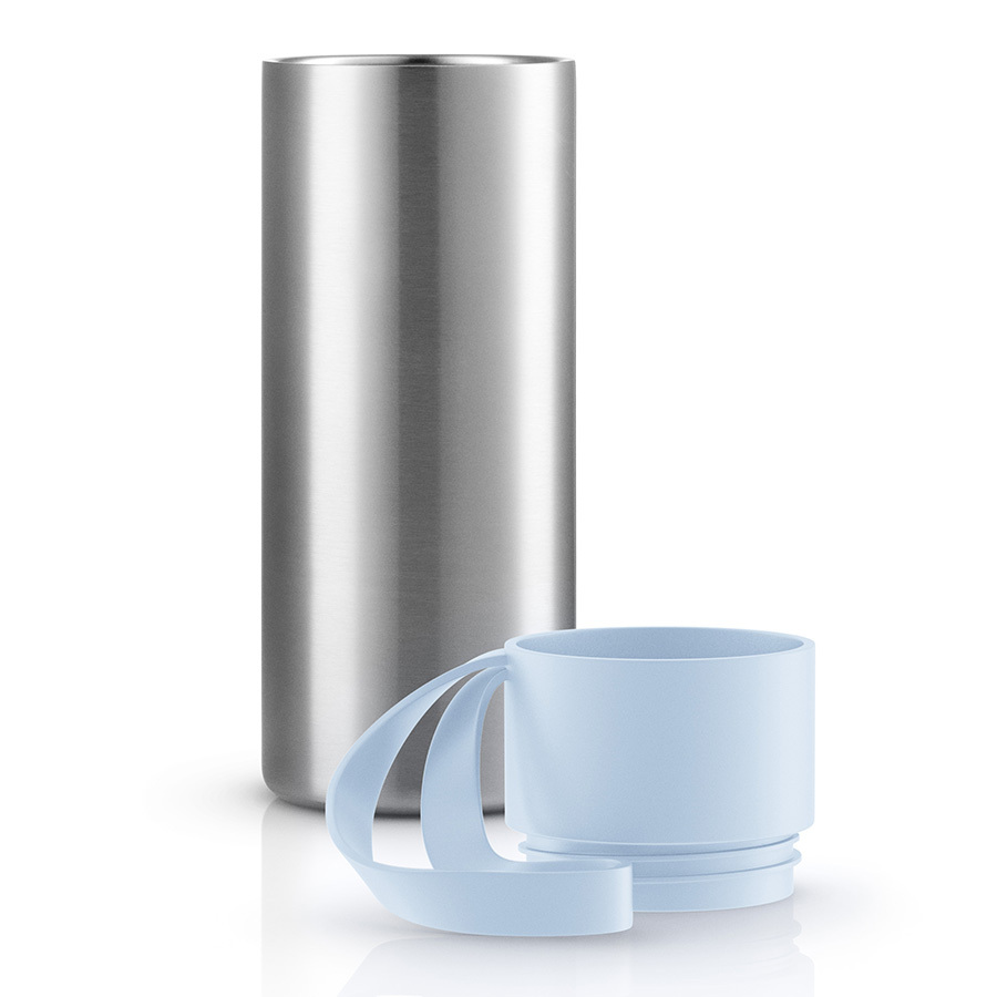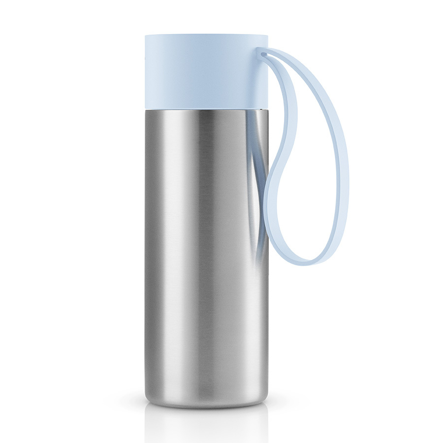 Крышка легко открывается и закрывается даже на ходу, благодаря функциональному клапану. Корпус с двойными стенками надолго сохранит нужную температуру напитков. Практичный силиконовый ремешок удобен для переноски.
