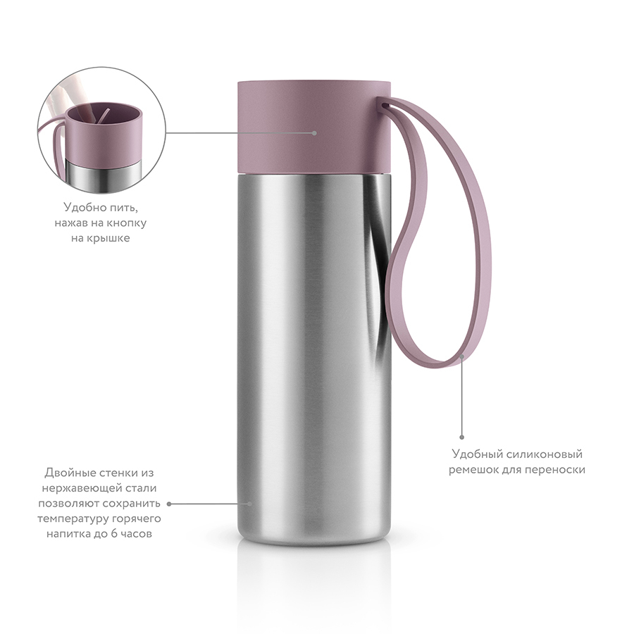 Небольшой компактный термос позволяет взять с собой любимый холодный или горячий напиток на прогулку, в поездку на велосипеде или в машину. Модель имеет оптимальный размер и объем – 350 мл – поэтому прекрасно помещается в сумку или рюкзак, а также в автомобильный держатель для чашек. Благодаря мягкому силиконовому ремешку термос удобно носить с собой в руке. Модель выполнена из прочной нержавеющей стали. Конструкция термоса основывается на двойной стенке с вакуумом внутри, благодаря чему напитки сохраняют свою первоначальную температуру максимально долго. Термос можно мыть в посудомоечной машине, крышку рекомендуется мыть отдельно вручную.