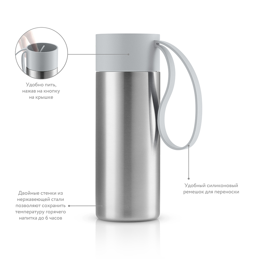 Термос можно брать с собой куда угодно. Крышка легко открывается и закрывается даже на ходу благодаря функциональному клапану, с которым легко справиться одной рукой. Наполните термос To Go кофе или другим напитком - и двойные герметичные стенки надёжно сохранят напиток горячим или холодным. Практичный силиконовый ремешко поможет взять термос с собой и всегда иметь возможность выпить горячего или холодного напитка. Сделан из стали, пластика и силикона. Можно мыть в посудомоечной машине. Объём 350 мл. Высота 20 см.