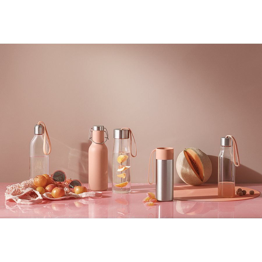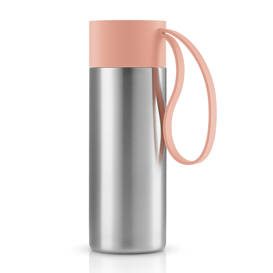 Крышка легко открывается и закрывается даже на ходу, благодаря функциональному клапану. Корпус с двойными стенками надолго сохранит нужную температуру напитков. Практичный силиконовый ремешок удобен для переноски.