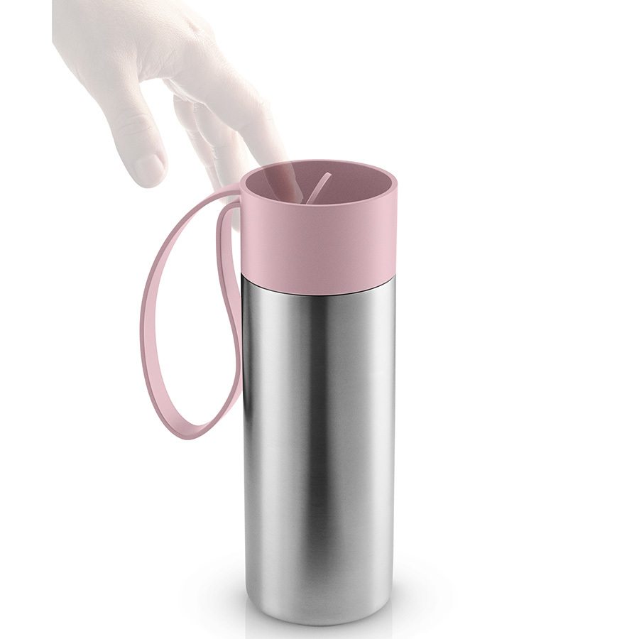Крышка легко открывается и закрывается даже на ходу, благодаря функциональному клапану, с которым легко справиться одной рукой. Наполните термос горячим кофе или прохладным лимонадом, двойные герметичные стенки сохранят нужную температуру в течение нескольких часов. Практичный силиконовый ремешок удобен для переноски. Объем: 350 мл.