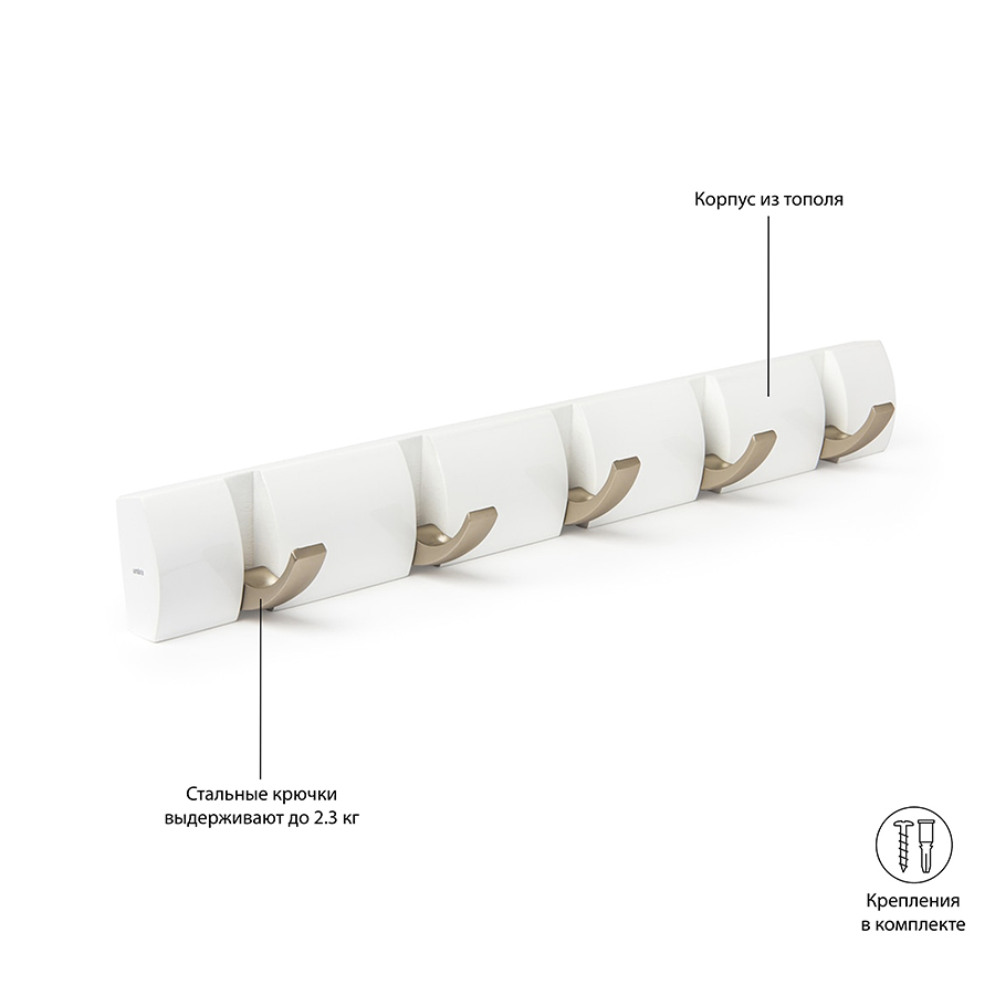 Вешалка имеет 3 откидных крючка из никеля: когда они не используются, их можно легко сложить. Каждый крючок выдерживает нагрузку до 2,3 кг. Вешалка поставляется с подробной инструкцией по установке и необходимым монтажным оборудованием.