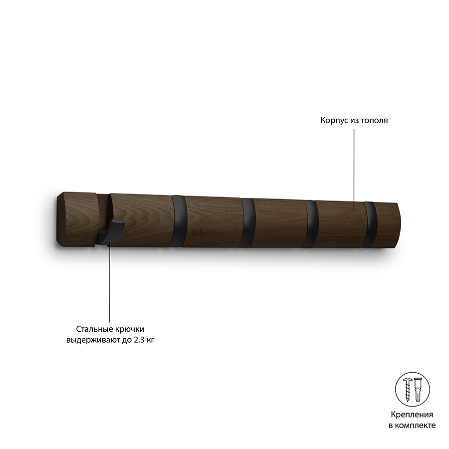 Вешалка имеет 5 откидных крючков из никеля: когда они не используются, их можно легко сложить. Каждый крючок выдерживает вес до 2,3 кг. Поставляется с подробной инструкцией по установке и необходимым монтажным оборудованием.
