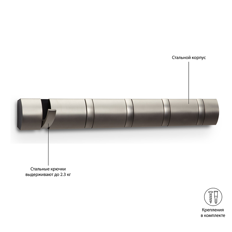 Настенная вешалка Flip станет изысканным украшением современного или классического интерьера дома. Особенность модели – это идеальное сочетание оригинального дизайна и компактных форм. Конструкция имеет 5 выдвижных крючков, именно поэтому вешалка отлично подойдет для небольших помещений. Мебель для прихожей оснащена гладким профилем и скрытой крепежной панелью, благодаря которой она без проблем монтируется на любой стене. Вешалка канадского бренда Umbra выполнена из высококачественного никеля, отличающегося прочностью и износоустойчивостью. К основанию изделия прикреплены эргономичные крючки, которые выдерживают нагрузку до 2,3 кг. Вешалка подойдет для хранения верхней одежды, сумок, зонтов и прочих аксессуаров всей семьи. Материал: металл. Размер: 51х7х3 см.
