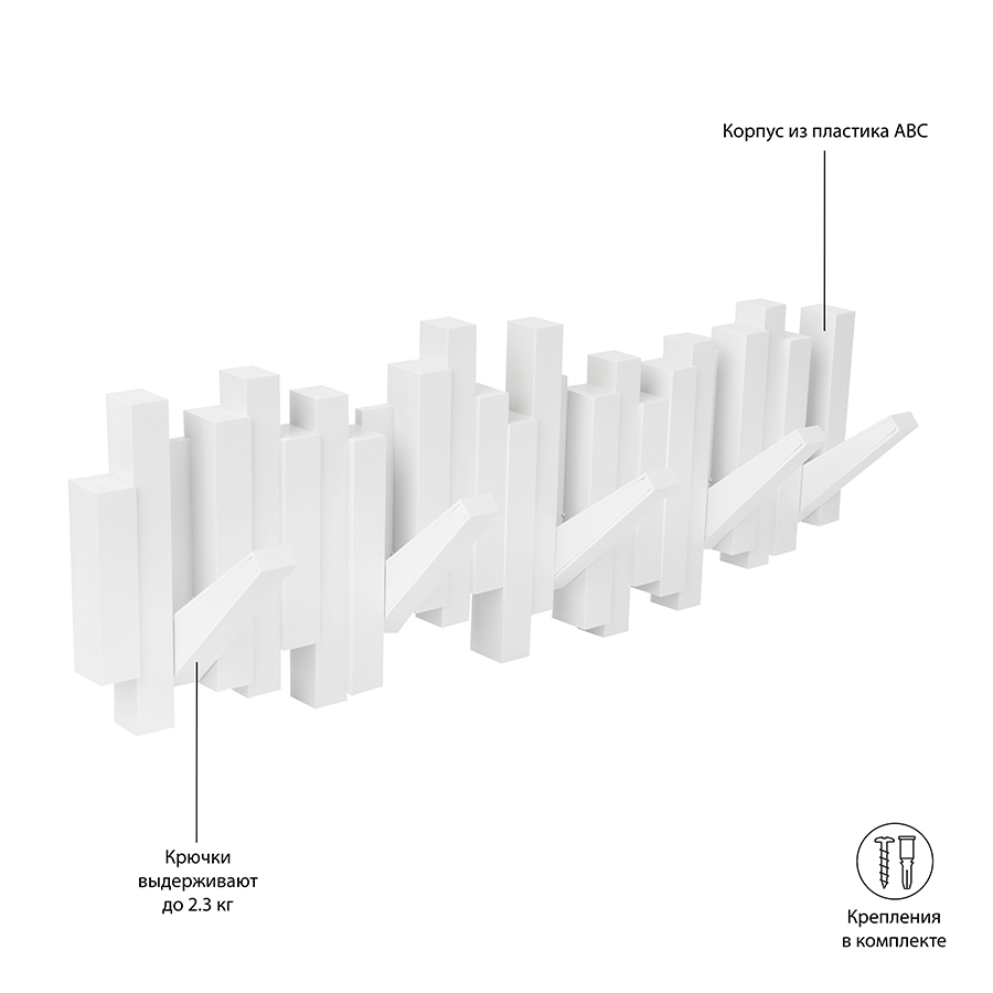 Пять прочных крючков при необходимости складываются, превращая вешалку в декоративный элемент. Каждый крючок выдерживает вес до 2,26 кг. В комплект поставки входит крепеж, что делает установку простой и быстрой.