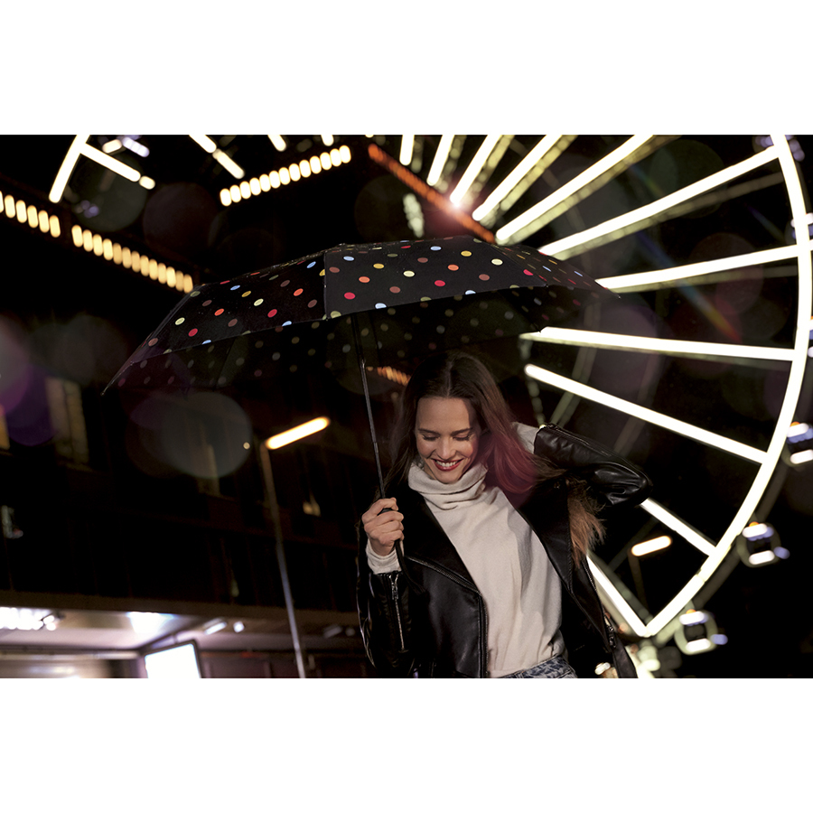 Диаметр купола: 99 см. Все модели проходят испытания в аэродинамической трубе при скорости ветра до 120 км/час. В случае, если зонт вывернется в обратную сторону, конструкция не повредится. Большая кнопка позволяет легко открывать и закрывать зонт. Эргономичная ручка помещается в ладони и не выскальзывает благодаря ремешку, который надевается на запястье. Зонт помещается в защитный чехол для компактного хранения. Прочный, водоотталкивающий полиэстер выполнен из переработанного пластика PET.