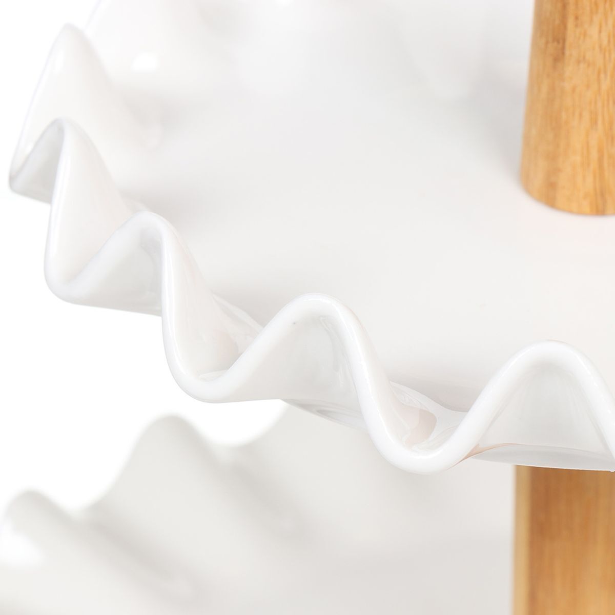 Двухъярусная фруктовница выполнена из керамики в виде двух блюд на деревянной ножке. Фруктовница станет идеальным украшением любой кухни или прекрасным подарком для вас и ваших близких.