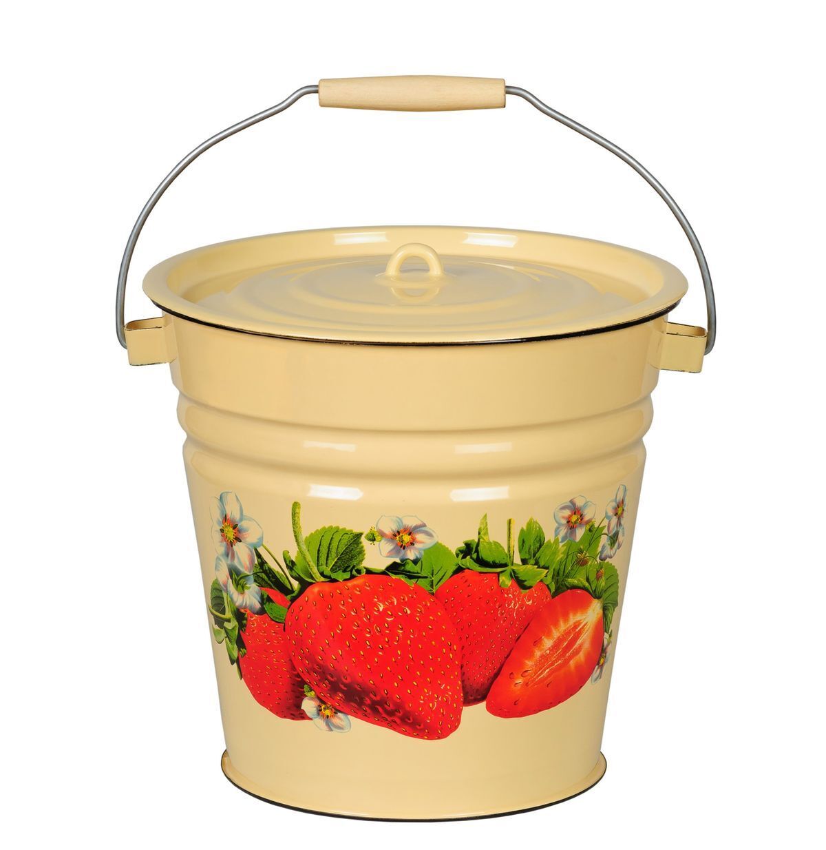 Классическое эмалированное ведро с крышкой и ручкой, снабженной деревянным держателем — такое можно встретить на многих дачах и в загородных домах. В нем удобно хранить фрукты и овощи, а при желании можно использовать вместо большой кастрюли, чтобы сварить варенье, компот или суп. Крышка предотвращает испарение жидкости, а также защищает от попадания инородных предметов в пищу (различного мусора, пыли, насекомых). Деревянный держатель на ручке добавляет удобства при переноске полного ведра.