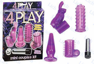 Очень качественный и удобный набор: вибро-пулька и четыре насадки из нежного силикона. Регулятор вибрации находится на крышечке самого вибратора. Насадки очень разнообразны по своей функциональности: 1. Анальная пробка. Одевается непосредственно на вибро-пульку - и получаем анальную пробку с вибрацией. 2. Пальчик - одевается либо на вибро-пульку для стимуляции клитора и предвагинальной зоны, либо на палец. Для дополнительной стимуляции пальчик покрыт пупырышками. 3. Насадка на член с пупырышками. 4. Зайчик для клитора - насадку можно надеть на половой член или на палец. Вибро-пулька вставляется в специальное отверстие. Вибро-пулька длиной 6 см, диаметром 1 см. Анальная пробка длиной 8 см, диаметр головки 1 см, диаметр широкой части 2 см. Пальчик длиной 7 см, диаметр 3 см, может растягиваться до 6 см. Насадка на член с пупырышками - длиной 4 см, диаметром 2,5 см, растягивается до 6 см. Зайчик для клитора длиной 3,5 см, диаметром 1,5 см, растягивается до 5 см. Для вибратора требуется три батарейки таблетка , которые вставляются во внутрь вибратора,