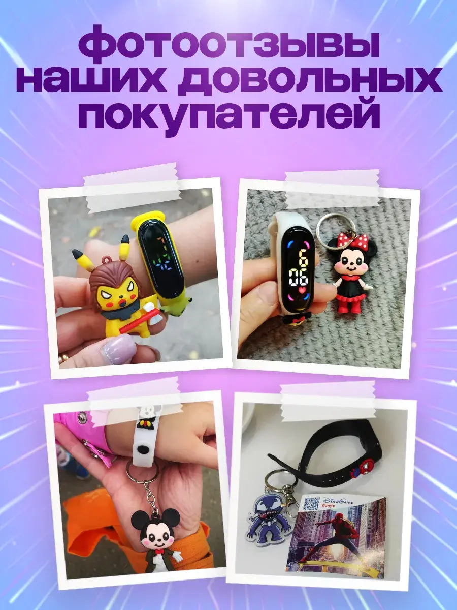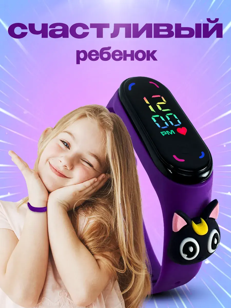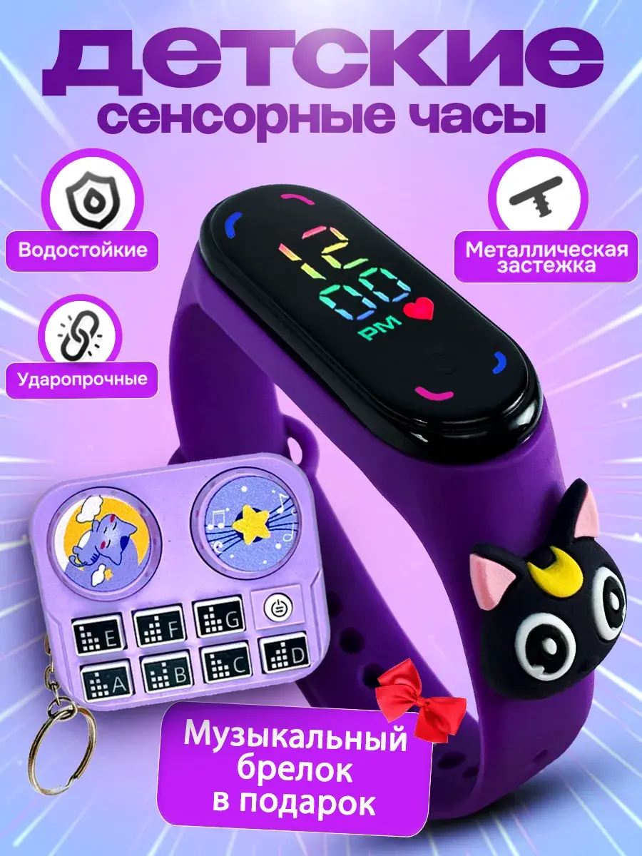 Детские наручные часы для девочек и мальчиков с сенсорным управлением в комплекте с музыкальным брелком от бренда DinoShop обязательно понравятся каждому ребенку. Электронные часы на руку с цифровым циферблатом, на дисплее отображает время минуты арабскими цифрами в 12 часовом формате дату секундомер с помощью нажатия сенсорной кнопки. Оригинальный влагостойкий ремешок создан из безопасного гипоаллергенного силикона с надежной металлической застежкой без проблем регулируется по длине с помощью отверстий на запястье ручки ребенка и исключает их потерю. Это противоударный устойчивый к влаге аксессуар, который в отличие от обычных часов можно мыть, не нужно заряжать (на батарейках). Овальные силиконовые браслеты электронных часов наручных подходят для Mi Band. Любимый супер герой из команды мультиков Сейлормун, форма которого украшает ремень подарит радость вашему ребенку. Ручные часики мордашки Симба как игрушечные развлекут маленьких малышей, если знакомство с часами еще рано. Популярная модель версии 2.0 идеальна для дошкольников школьников младших классов которые хотят выглядеть стильно каждый день. Спортивные походные детские часики подойдут для активного отдыха - бег фитнес туризм или повседневной носки дома, на учебу в школе. Часы Сейлор Мун ударопрочные не боятся брызг воды. Универсальные необычные украшения с водонепроницаемым корпусом - отличный подарок для детей которые дополнят модный современный образ на прогулке. Самый красивый сувенир с рисунком в виде кошки станет приятным подарком дочери, сестре, племяннице на праздник года день рождения выпускной ученику 1 класс и др.