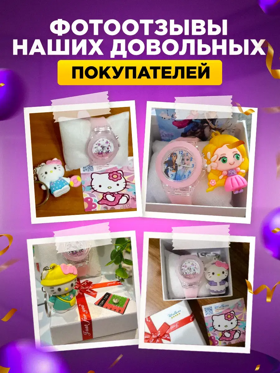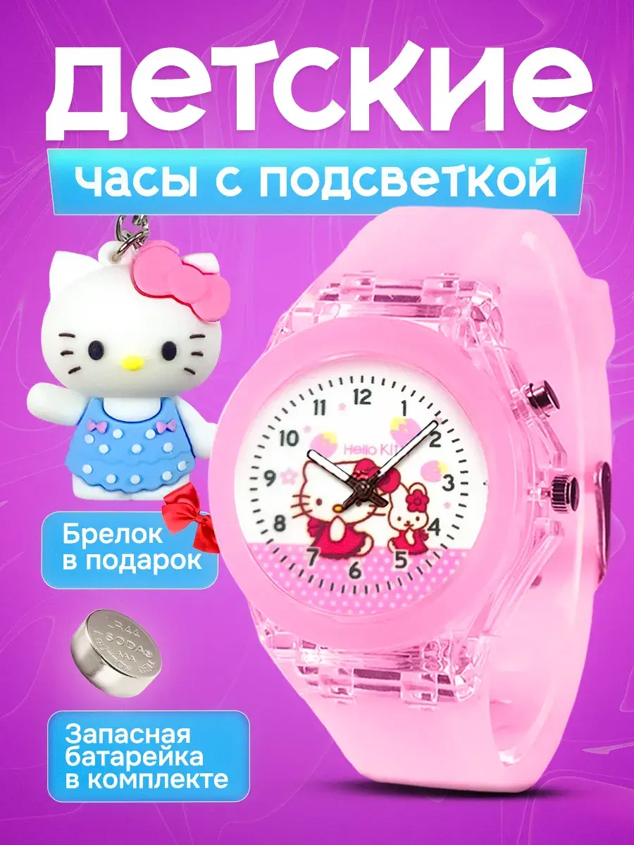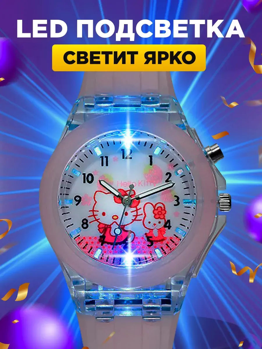 Яркие детские наручные часы - модный аксессуар для девочек с важным функциональным предназначением. Благодаря наличию такого типа часов ребенок научится смотреть слушать тик так распознавать время планировать свои дела. Учебные ходики на руку кварцевые не электронные на батарейках представлены с рисунком – любимые герои из мультиков мимимишные мордашки Хелло Китти. Красивые со стрелками с качественным механизмом прочным гипоаллергенным силиконовым браслетом - классика которая всегда в тренде. Стильные модные пластиковые часики и ремешки оснащены LED - подсветкой как ручные украшения подходят для ежедневной носки. Если знакомство с часами для ребенка еще рано малыши оценят их как игрушка светящаяся в темноте. Диаметр циферблата с арабскими цифрами защищен прочным акриловым стеклом, а ремень с регулируемой по длине застежкой обеспечивает комфортное ношение исключая их потерю идеально для школьников подростков занятий спортом бег велосипед фитнес. Корпус детских часов для девочки круглой формы мигает переливается разными цветами, картинки hello kitty не оставят равнодушными самых маленьких и старше. Наличие минутной секундной стрелок пробуждает интерес к течению времени. Прозрачные светодиодные часики дети с радостью возьмут с собой в детский сад школу во двор на прогулку уличные обычные игры создав модный образ. Спортивные можно использовать как походные для туризма – большой экран крупные цифры делают использование легким приятным. Отличный подарок от бренда DinoShop дочке 6 лет сестре внучке на любой праздник года день рождения 8 лет первый юбилей и др. В наборе идет подарочная коробка для создания праздничной обстановки. Качественная стильная вещь станет любимым аксессуаром малышки.