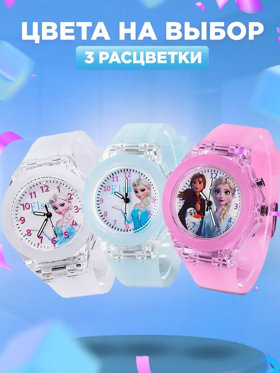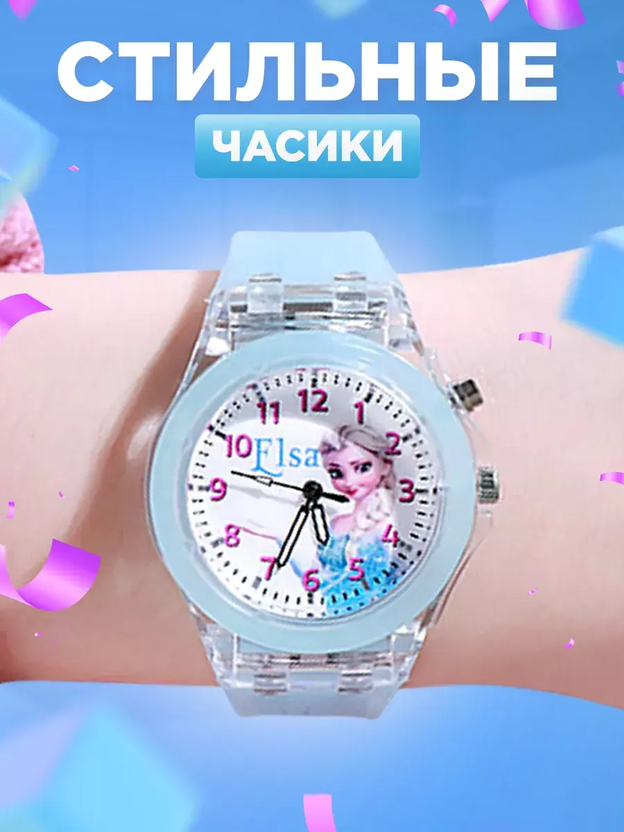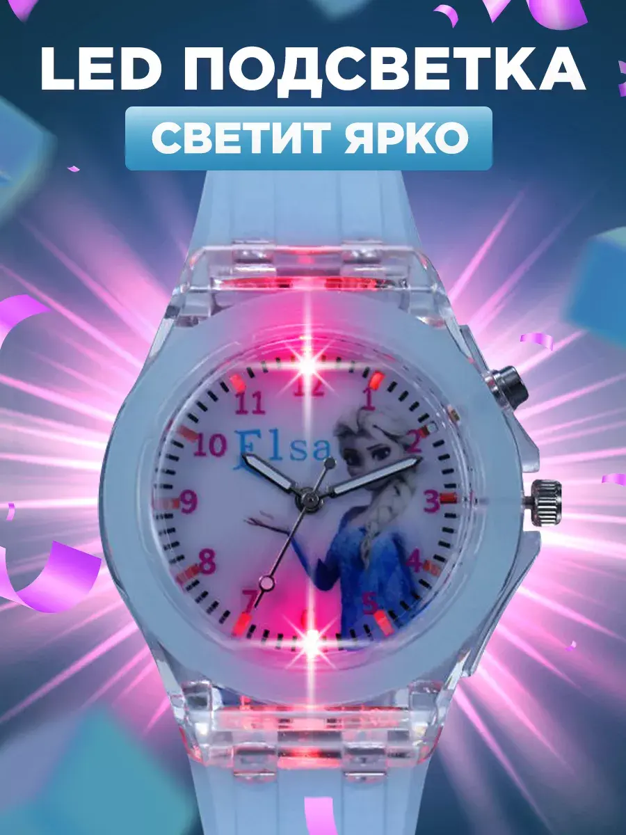 Яркие детские наручные часы - модный аксессуар для девочек с важным функциональным предназначением. Благодаря наличию такого типа часов ребенок научится смотреть слушать тик так распознавать время планировать свои дела. Учебные ходики на руку кварцевые не электронные на батарейках представлены с рисунком – любимые герои из мультиков мимимишные мордашки Холодное Сердце Анна и Эльзы. Красивые со стрелками с качественным механизмом прочным гипоаллергенным силиконовым браслетом - классика которая всегда в тренде. Стильные модные пластиковые часики и ремешки оснащены LED - подсветкой как ручные украшения подходят для ежедневной носки. Если знакомство с часами для ребенка еще рано малыши оценят их как игрушка светящаяся в темноте. Диаметр циферблата с арабскими цифрами защищен прочным акриловым стеклом, а ремень с регулируемой по длине застежкой обеспечивает комфортное ношение исключая их потерю идеально для школьников подростков занятий спортом бег велосипед фитнес. Корпус детских часов для девочки круглой формы мигает переливается разными цветами, картинка Эльзы не оставят равнодушными самых маленьких и старше. Наличие минутной секундной стрелок пробуждает интерес к течению времени. Прозрачные светодиодные часики кварц дети с радостью возьмут с собой в детский сад школу во двор на прогулку уличные обычные игры создав модный образ. Спортивные можно использовать как походные для туризма – большой экран крупные цифры делают использование легким приятным. Отличный подарок от бренда DinoShop дочке сестре внучке на любой праздник года день рождения первый юбилей и др. В наборе идет подарочная коробка для создания праздничной обстановки. Качественная стильная вещь станет любимым аксессуаром малышки.