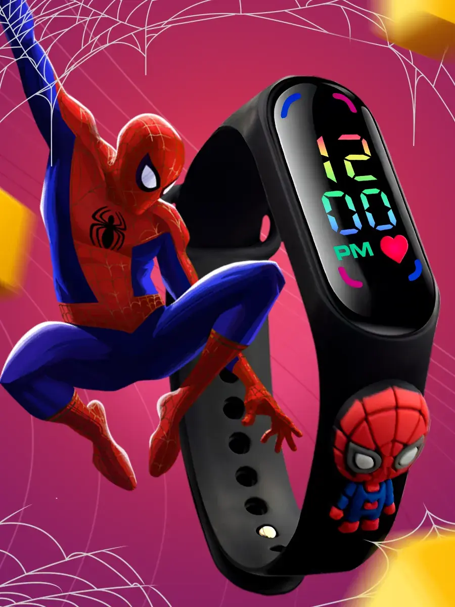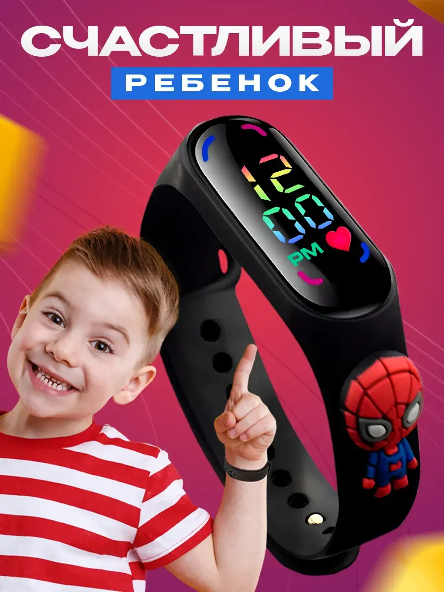 Детские наручные часы для мальчиков и девочек с сенсорным управлением от бренда DinoShop - нужный и полезный аксессуар! Электронные часики на руку с цифровым дисплеем отображает время арабскими цифрами в 12 часовом формате, переключение между режимами времени и даты осуществляется нажатием сенсорной кнопки. Оригинальный силиконовый ремешок с изображением человека паука создан из безопасного гипоаллергенного материала. Мягкий ремешок электронных ручных часов подходит для Mi Band. Металлическая застёжка обеспечивает удобную регулировку и надёжную фиксацию на ручке ребёнка. Противоударный и водостойкий пластмассовый корпус защищает часы не только от повреждений, но и от попадания воды, в них можно мыть руки. Маленькие часы работают от батарейки их не нужно заряжать. Для малышей часы могут стать не только стильным украшением, но и увлекательной игрушкой — благодаря яркому цветному циферблату и простому управлению они легко привлекают внимание и могут использоваться как игрушечные, помогая дошкольнику познакомиться с понятием времени. В комплекте идет брелок с изображением любимых героев, который станет отличным дополнением к часам. Эти необычные красивые часики — отличный мини сувенир для вашего ребенка на день рождения или без повода. Дети разных возрастов - от детского сада до начальной школы будут в восторге от такого подарка, а вы можете быть уверены, что товар создан с учётом всех стандартов безопасности для малышей.