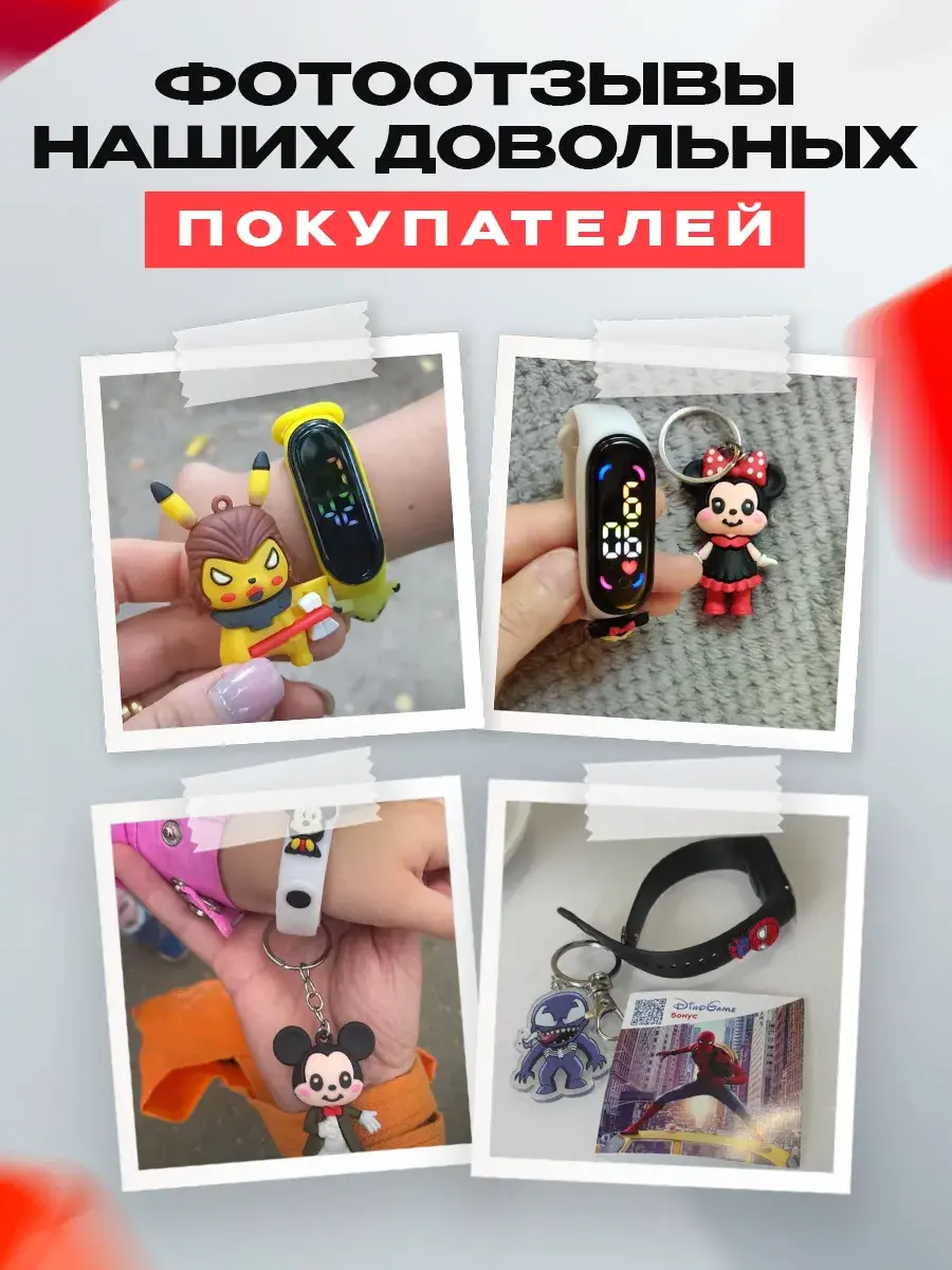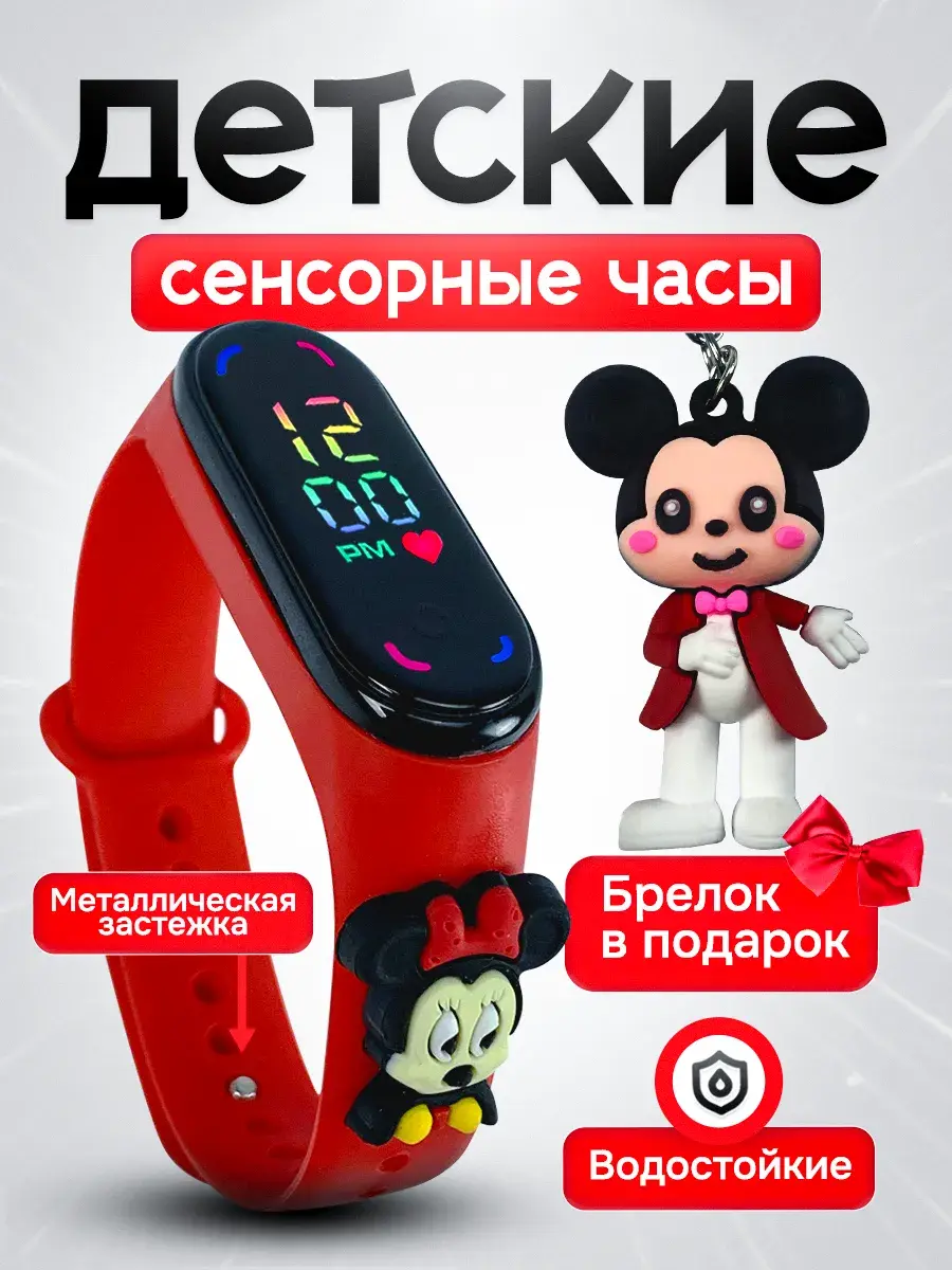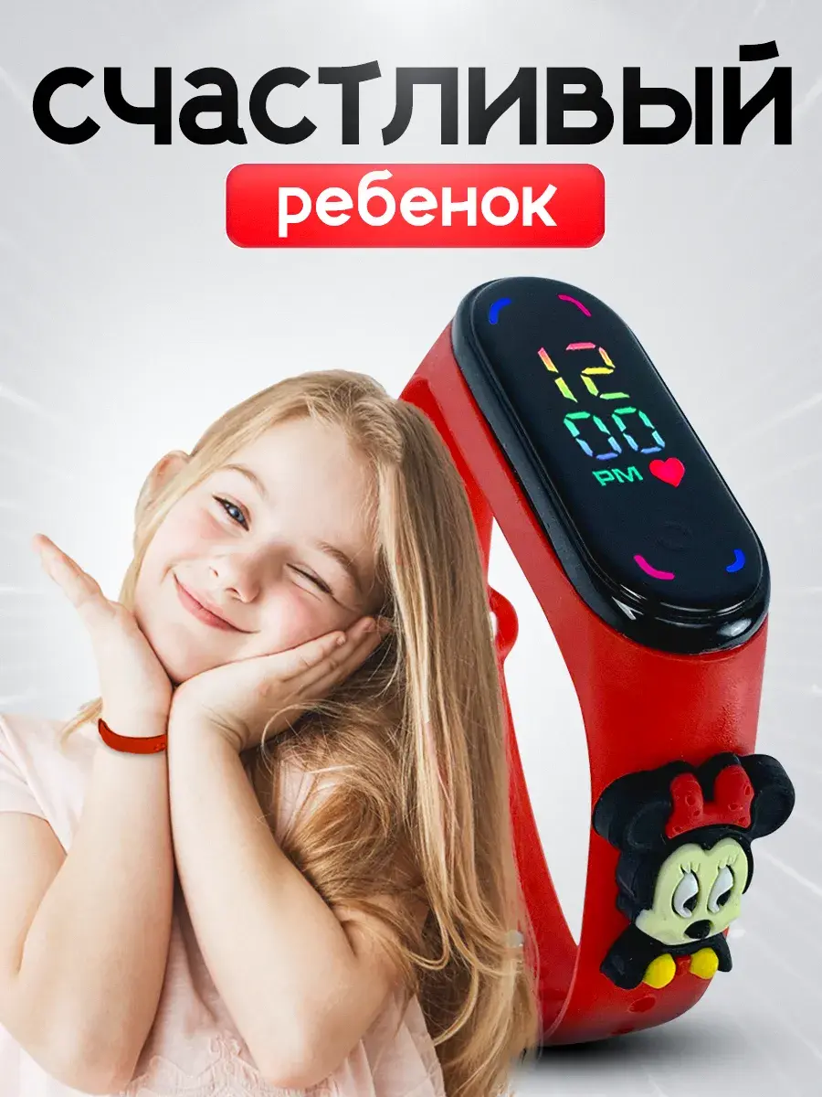 Детские наручные часы для девочек с сенсорным управлением от бренда DinoShop - стильный полезный аксессуар! Электронные часы на руку с цветным цифровым циферблатом - дисплеем отображает время минуты арабскими цифрами в 12 часовом формате дату секундомер с помощью нажатия сенсорной кнопки. Оригинальный влагостойкий ремешок создан из безопасного гипоаллергенного силикона с надежной металлической застежкой без проблем регулируется по длине с помощью отверстий на запястье ручки ребенка и исключает их потерю. Это противоударный устойчивый к влаге аксессуар, который в отличие от обычных часов можно мыть не нужно заряжать (на батарейках). Овальные силиконовые браслеты электронных часов наручных подходят для Mi Band. Любимый супер герой Минни маус из команды мультиков микки маус, форма которого украшает ремень подарит радость вашему ребенку. Ручные часики мордашки Мини маус как игрушечные развлекут маленьких малышей, если знакомство с часами еще рано. Популярная модель версии 2.0 идеальна для дошкольников школьников младших классов. Спортивные походные детские часы для девочки подойдут для активного отдыха - бег фитнес туризм или повседневной носки дома учебы в начальной школе или детском саду. Классические часы Микки ударопрочные не боятся брызг воды. Универсальные необычные украшения с водонепроницаемым корпусом - отличный подарок для детей девочке которые дополнят модный современный образ на прогулке. Самый красивый сувенир с рисунком в виде mickey станет приятным подарком дочери, сестре, племяннице на праздник года день рождения выпускной ученику 1 класс.