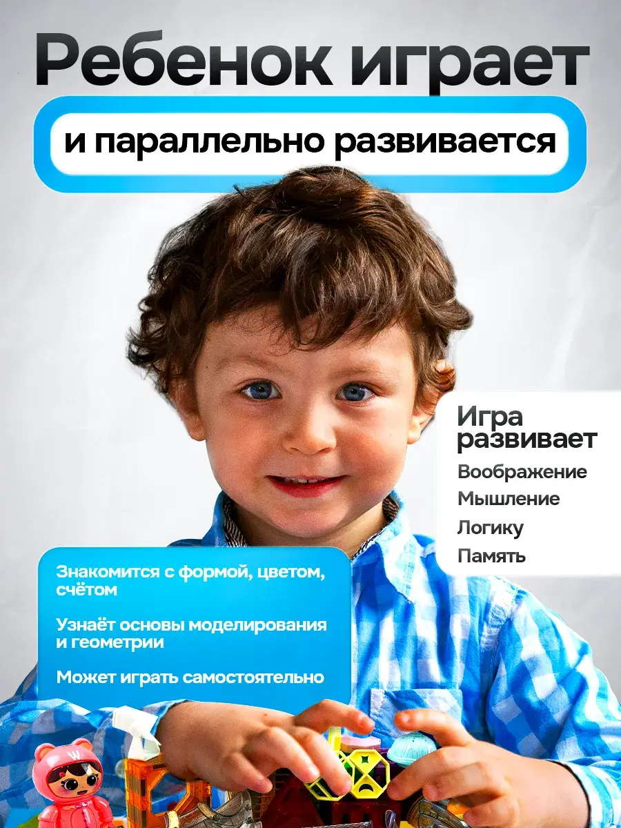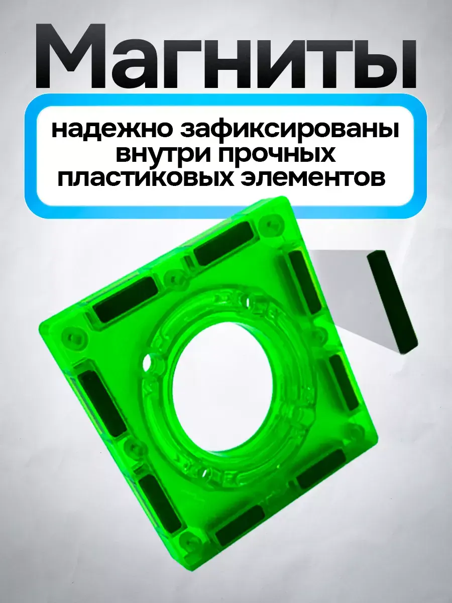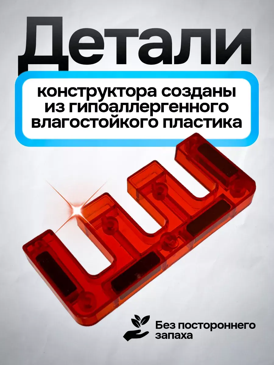 Светящийся конструктор не только увлекает, но и развивает: он помогает детям улучшать моторику, логику и креативное мышление. Прочные пластиковые элементы легко соединяются благодаря встроенным мощным неодимовым магнитам, что делает игру безопасной и увлекательной как для мальчиков, так и для девочек. Детали конструктора созданы из гипоаллергенного влагостойкого пластика с закругленными краями чтобы ребенок не смог травмироваться и проглотить их.
