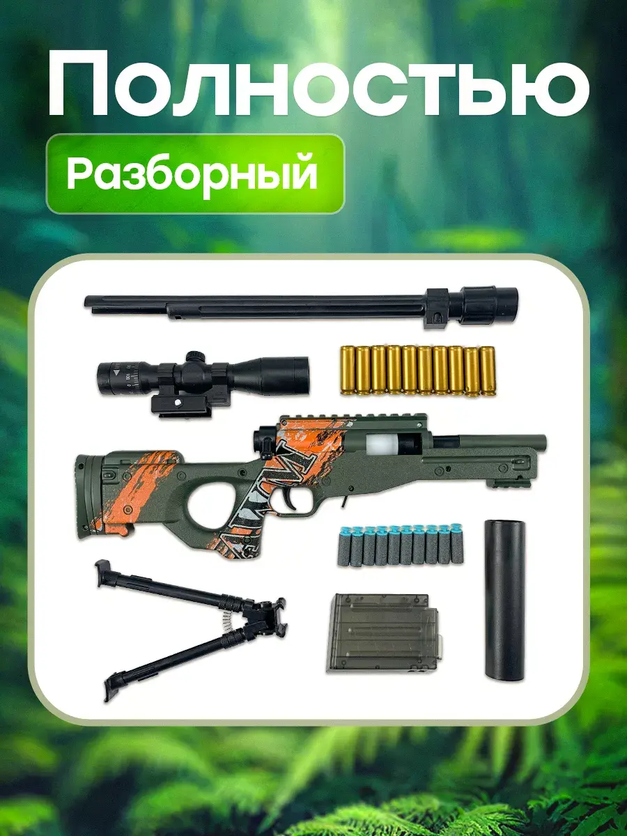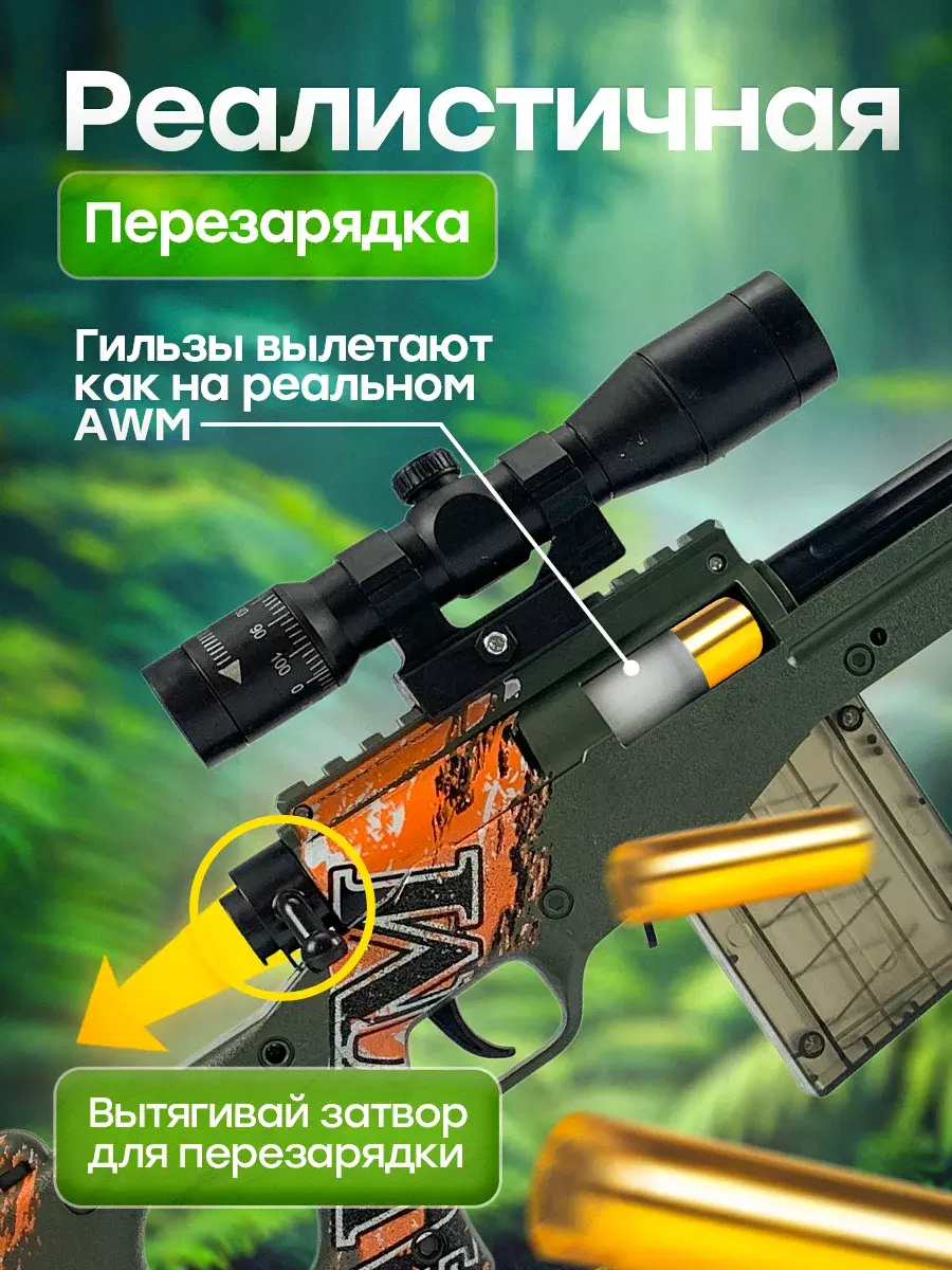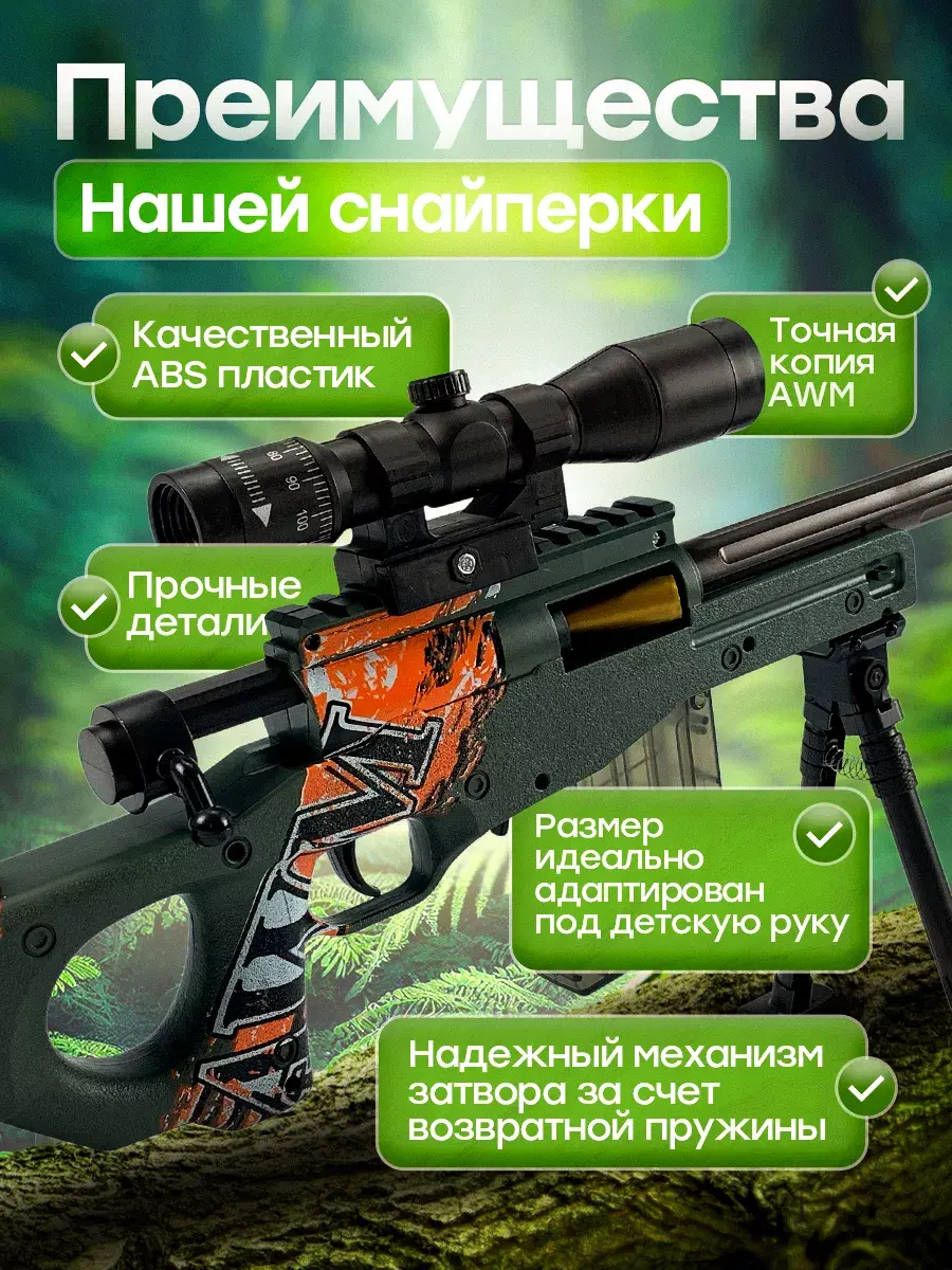 Крутая детская снайперская винтовка с мягкими пульками станет идеальным подарком для детей с 3 лет. Это уменьшенная копия настоящей снайперки AWM. Игрушечная винтовка является совершенно безопасной, из пушки можно стрелять мягкими пулями с присосками и без них. Автомат с глушителем, магазином и сошками, подставкой - винторез с звуковым эффектом предназначена для игры в меткого стрелка. АВМ имеет надежные крепления и отличается высоким качеством деталей, выстрел напоминает звук лопнувшего шарика. Оптический прицел добавляет реализма, позволяя улучшить свои навыки точной стрельбы. Длина ружья 83 см. Набор патронов в комплекте. Детская воздушка имеет мощный механизм, выстрел осуществляется за счет сжатого воздуха который формируется после взвода затвора, позволяет стрелять на расстояние до 10-15 метров. Крутой автомат не оставит равнодушными фанатов шутеров кс го и он круче чем любой автоматический пулемет или пистолет с пульками. Уникальная игровая винтовка AWP, резинкострел создан специально для мальчиков. Детское ружье СВД хороший вариант для тира и стрельбы с пластмассовыми патронами. После каждого перезаряда, использованная гильза эффектно выпадает вправо, как и у настоящей винтовки. Винтовка снайперская с прицелом прекрасно подойдет в качестве сюрприза на день рождения и станет отличным подарком от бренда DinoShop для вашего ребенка, сына, племянника, внука. Закажите прямо сейчас и добавьте в свою жизнь много приятных моментов, вызывающих самые яркие эмоции!