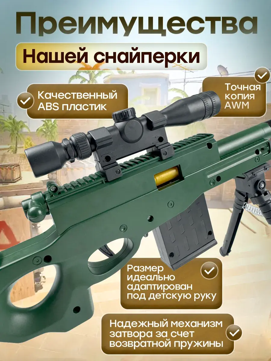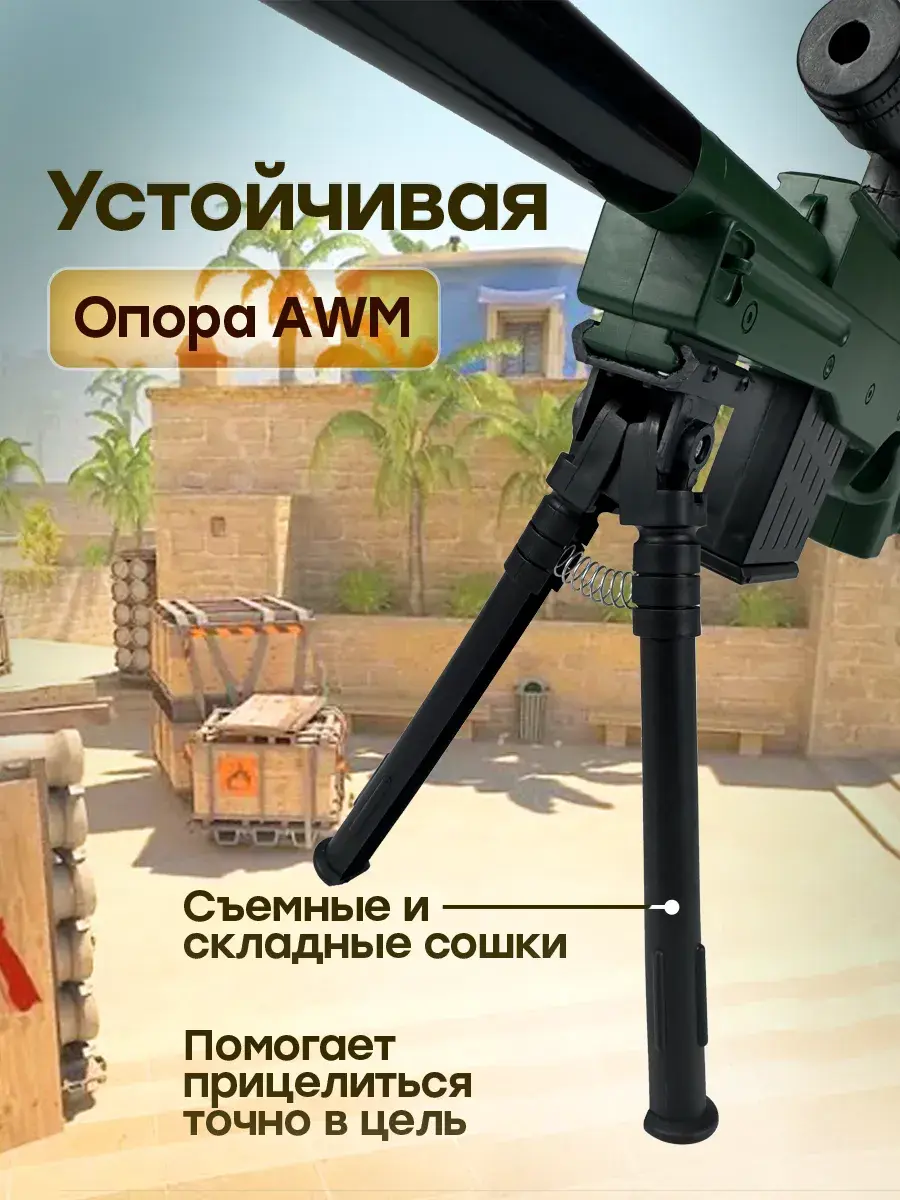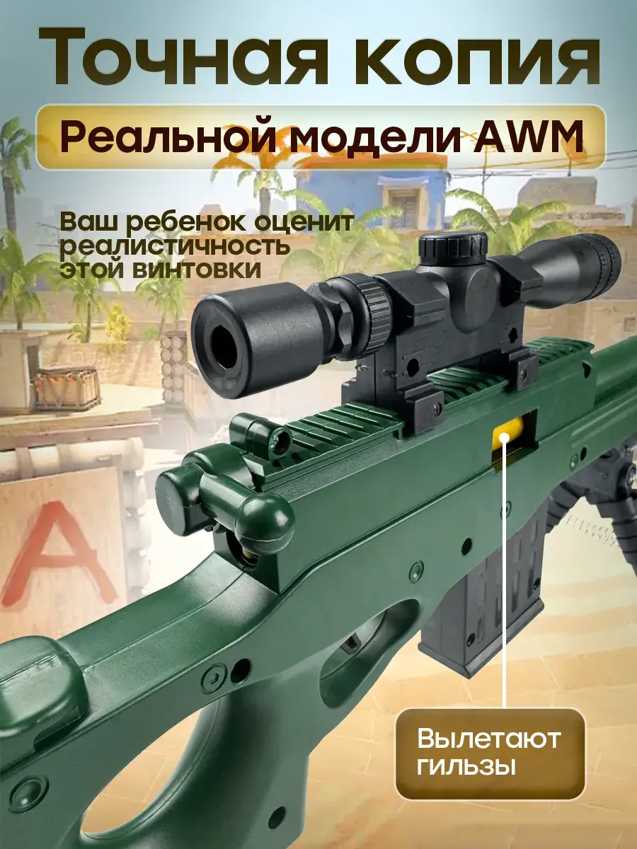 Крутая детская снайперская винтовка с пульками станет идеальным подарком для детей с 3 лет. Это уменьшенная копия настоящей снайперки AWM. Игрушечная винтовка является совершенно безопасной для детей, из пушки можно стрелять пулями. Автомат с глушителем, магазином и сошками, подставкой. Винторез с звуковым эффектом предназначена для игры в меткого стрелка. АВМ имеет надежные крепления и отличается высоким качеством деталей, выстрел напоминает звук лопнувшего шарика. Оптический прицел добавляет реализма, позволяя улучшить свои навыки точной стрельбы. Длина ружья 67 см. Набор патронов в комплекте. Детская воздушка имеет мощный механизм, выстрел осуществляется за счет сжатого воздуха который формируется после взвода затвора. Крутой автомат не оставит равнодушными фанатов шутеров кс го и он круче чем любой пулемет или пистолет с пульками. Уникальная игровая винтовка AWP, резинкострел создан специально для мальчиков. Детское ружье СВД хороший вариант для тира и стрельбы с пластмассовыми патронами. После каждого перезаряда, использованная гильза эффектно выпадает вправо, как и у настоящей винтовки. Винтовка снайперская с прицелом прекрасно подойдет в качестве сюрприза на день рождения и станет отличным подарком от бренда DinoShop для вашего ребенка, сына, племянника, внука. Закажите прямо сейчас и добавьте в свою жизнь много приятных моментов, вызывающих самые яркие эмоции!