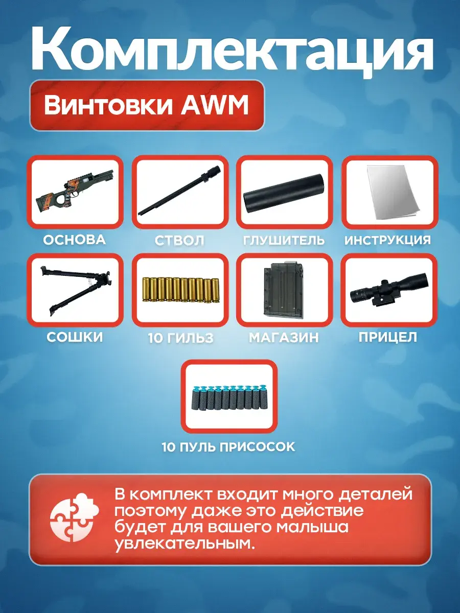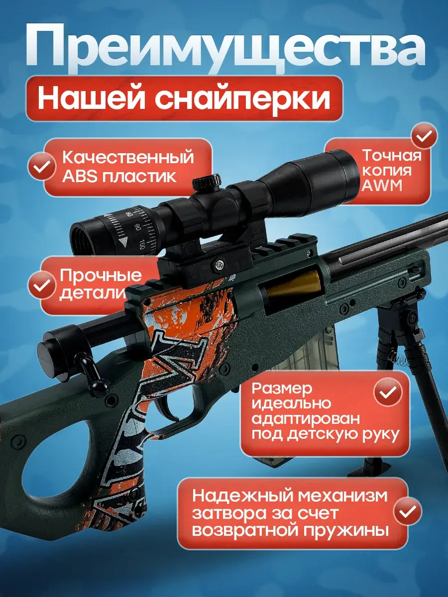 Крутая детская снайперская винтовка с мягкими пульками станет идеальным подарком для детей с 3 лет. Это уменьшенная копия настоящей снайперки AWM. Игрушечная винтовка является совершенно безопасной, из пушки можно стрелять мягкими пулями с присосками и без них. Автомат с глушителем, магазином и сошками, подставкой - винторез с звуковым эффектом предназначена для игры в меткого стрелка. АВМ имеет надежные крепления и отличается высоким качеством деталей, выстрел напоминает звук лопнувшего шарика. Оптический прицел добавляет реализма, позволяя улучшить свои навыки точной стрельбы. Длина ружья 83 см. Набор патронов в комплекте. Детская воздушка имеет мощный механизм, выстрел осуществляется за счет сжатого воздуха который формируется после взвода затвора, позволяет стрелять на расстояние до 10-15 метров. Крутой автомат не оставит равнодушными фанатов шутеров кс го и он круче чем любой автоматический пулемет или пистолет с пульками. Уникальная игровая винтовка AWP, резинкострел создан специально для мальчиков. Детское ружье СВД хороший вариант для тира и стрельбы с пластмассовыми патронами. После каждого перезаряда, использованная гильза эффектно выпадает вправо, как и у настоящей винтовки. Винтовка снайперская с прицелом прекрасно подойдет в качестве сюрприза на день рождения и станет отличным подарком от бренда DinoShop для вашего ребенка, сына, племянника, внука. Закажите прямо сейчас и добавьте в свою жизнь много приятных моментов, вызывающих самые яркие эмоции!