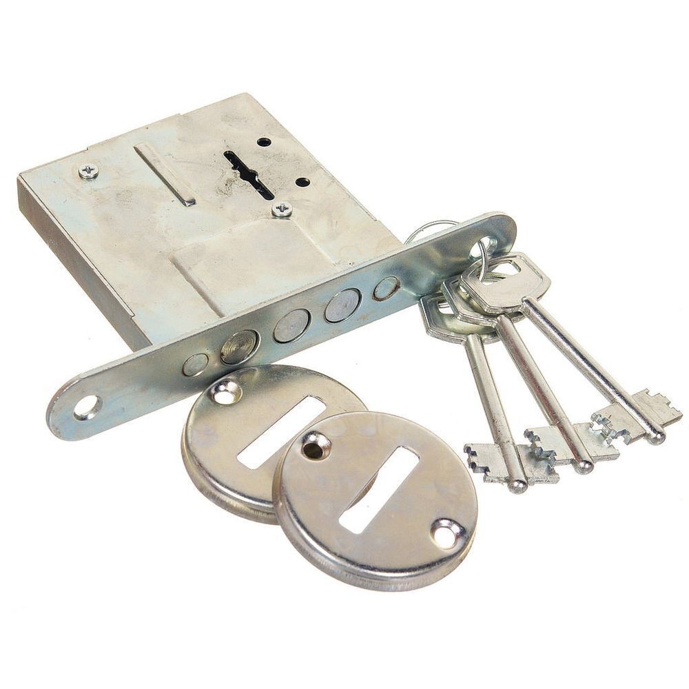Врезной замок с сувальдным механизмом секрета и тремя стальными ригелями.