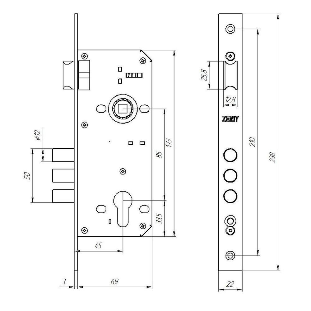 Замок врезной Зенит ЗВ4-85 цилиндрового типа предназначен для запирания левосторонних и правосторонних дверных полотен, открывающихся как внутрь, так и наружу. По посадочным размерам совпадает с замками Апекс 22 серии, Аллюр, Фуаро и другими замками китайского производства с межосевым расстоянием 85 мм. Замок рекомендуется устанавливать на наружные деревянные двери квартир и общественных зданий, толщина которых 40-45 мм, также возможен монтаж на металлические двери. Количество кодовых комбинаций цилиндрого механизма МЦ1-6 составляет 15.000 вариантов ключа. Замок врезной Зенит ЗВ4-85 цилиндрового типа сертифицирован по ГОСТ 5089 - замку присвоен 2 класс. Защелка дверного замка универсальная - смена стороны открывания происходит при вскрытии корпуса. Замок комплектуется фалевыми ручками с накладками типа РФ1-1-85. Дверные ручки крепятся между собой стяжными винтами.