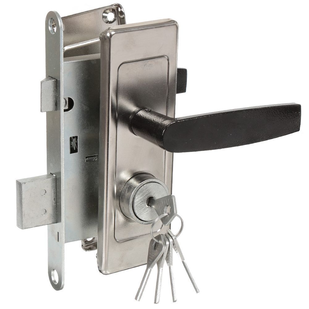 запирается замок кнопкой, отпирается ключом.