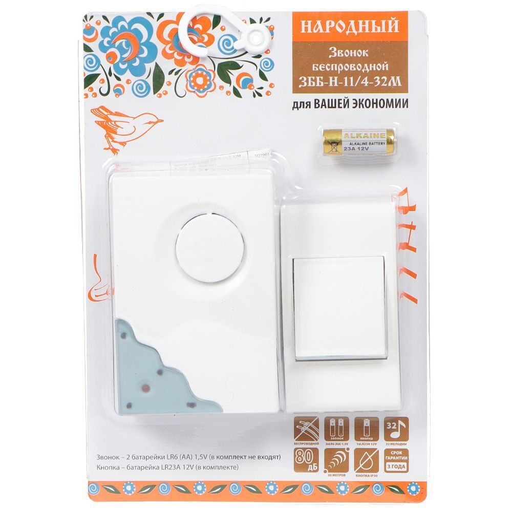 Звонок дверной беспров, на бат, 32мел, кнопка IP30, 2 х 1.5 В, АА, TDM, Народный ЗББ-Н-11/4-32М, SQ1