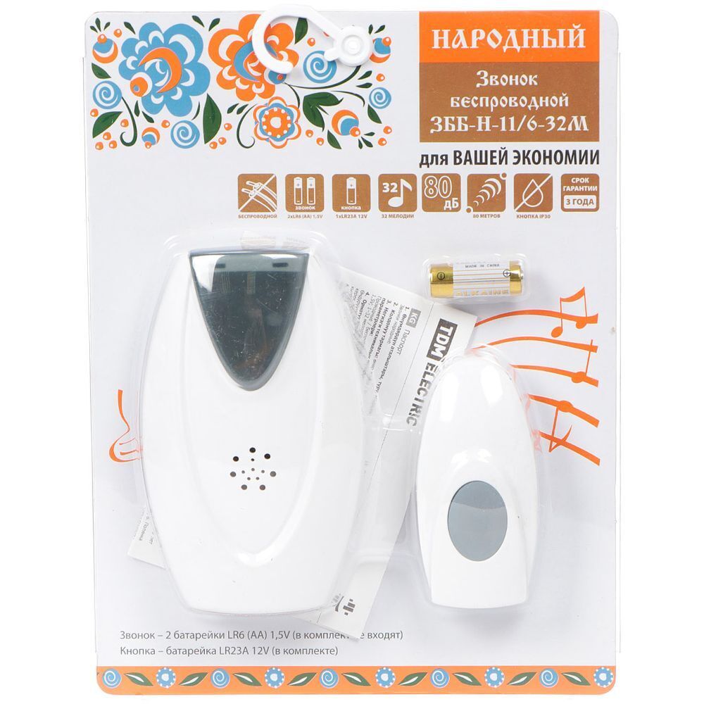 Звонок дверной беспров, на бат, 32мел, кнопка IP30, 2 х 1.5 В, АА, TDM, Народный ЗББ-Н-11/6-32М, SQ1