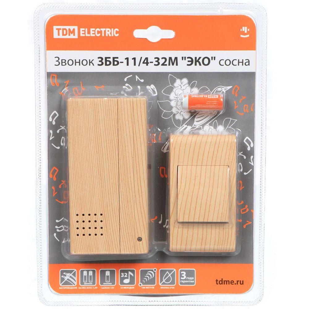 Звонок дверной беспров, на бат, 32мел, кнопка IP30, 2 х 1.5 В, ААА, сосна, TDM, ЗББ-11/4-32М Эко, SQ