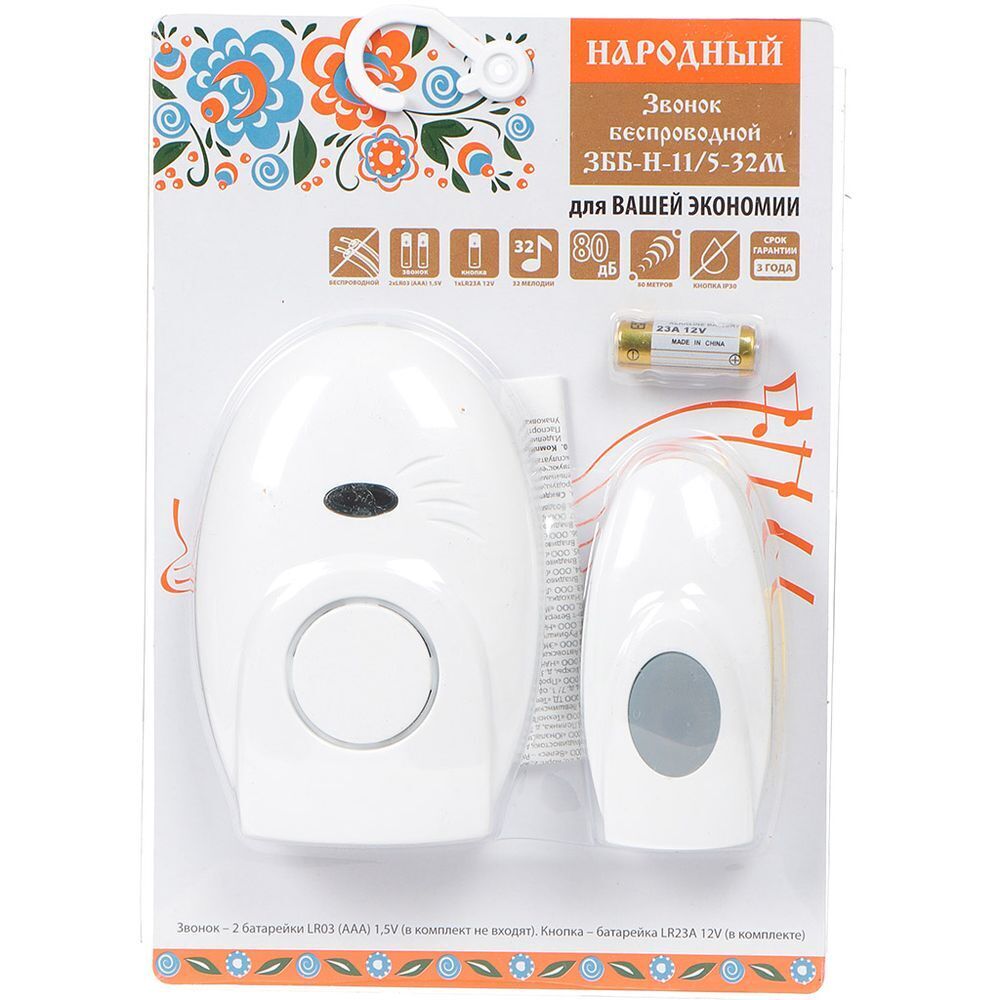 Звонок дверной беспров, на бат, 32мел, кнопка IP30, 2 х 1.5 В, ААА, TDM, Народный ЗББ-Н-11/5-32М, SQ